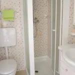 Inredningen inkluderar soffa samt TV. I badrummet finns även en bidé och en dusch.